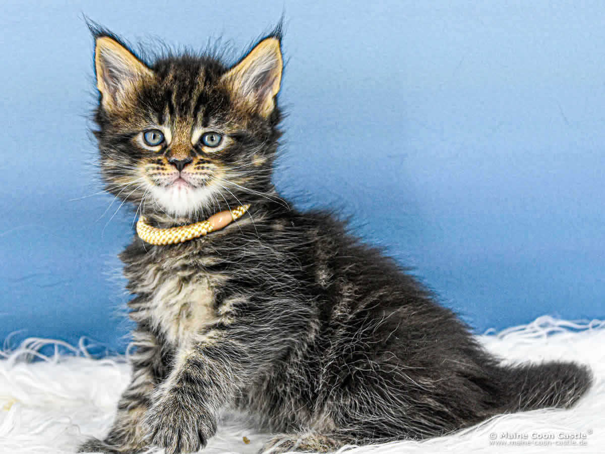 E4 Easy ist der, der immer lacht. Das Maine Coon Kitten entspricht der Zuchtlinie seiner Großmutter Ivette und repräsentiert den moderat habmodernen Typ der Maine Coon. E4 Easy ist ausgesprochen typvoll, hat jedoch im Gegensatz zu seinen Brüdern einen leichteren Körperbau. In dem Charakter des Jungen erkenne ich seine Großmutter Midnightfire’s Ivette.