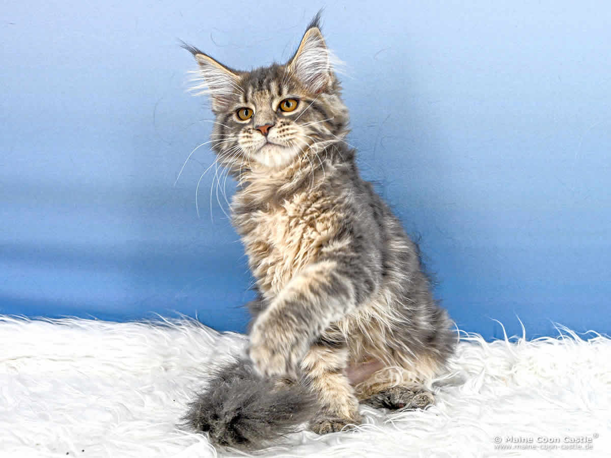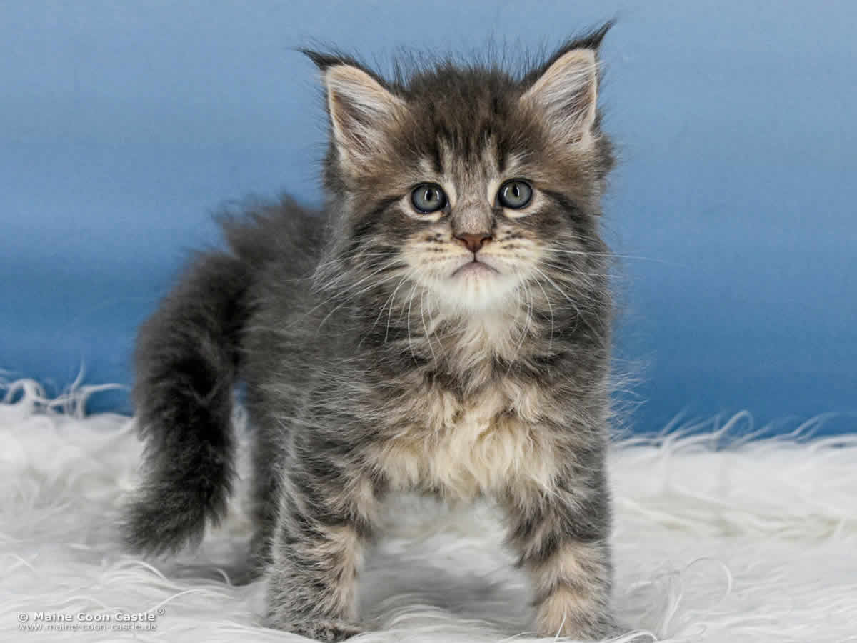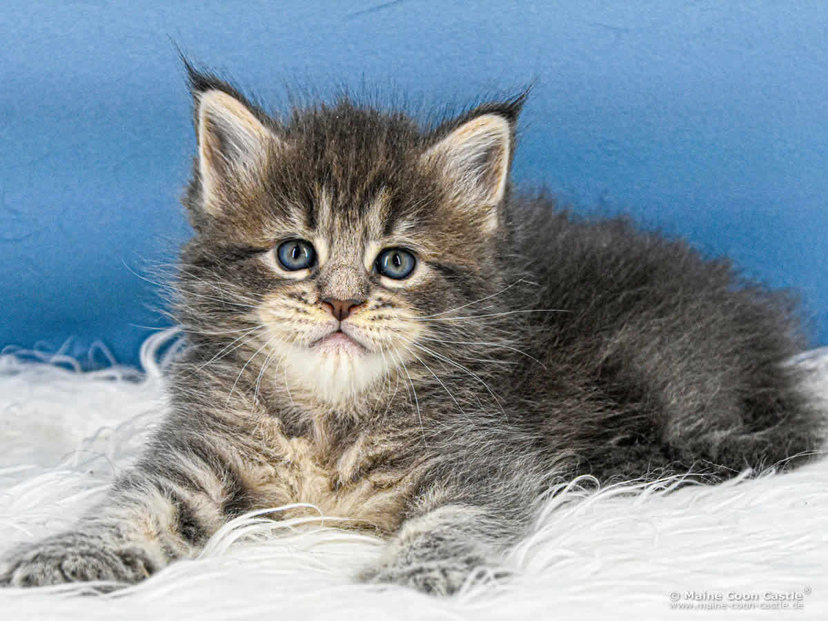 Blau, quadratisch und mit Bullerkopf. In dem Maine Coon Kitten E4 Emmy zeigen sich die alten Zuchtlinien von Maine Coon Castle.
