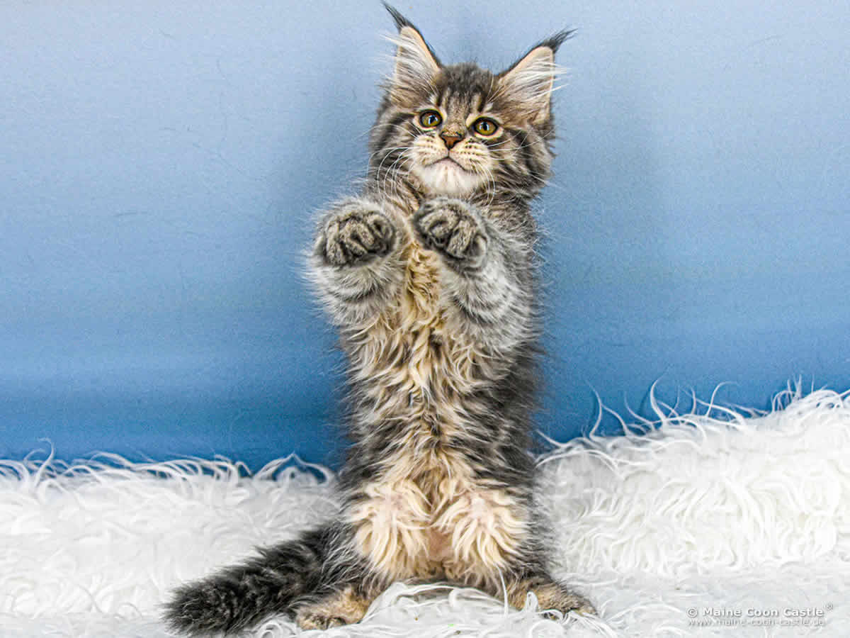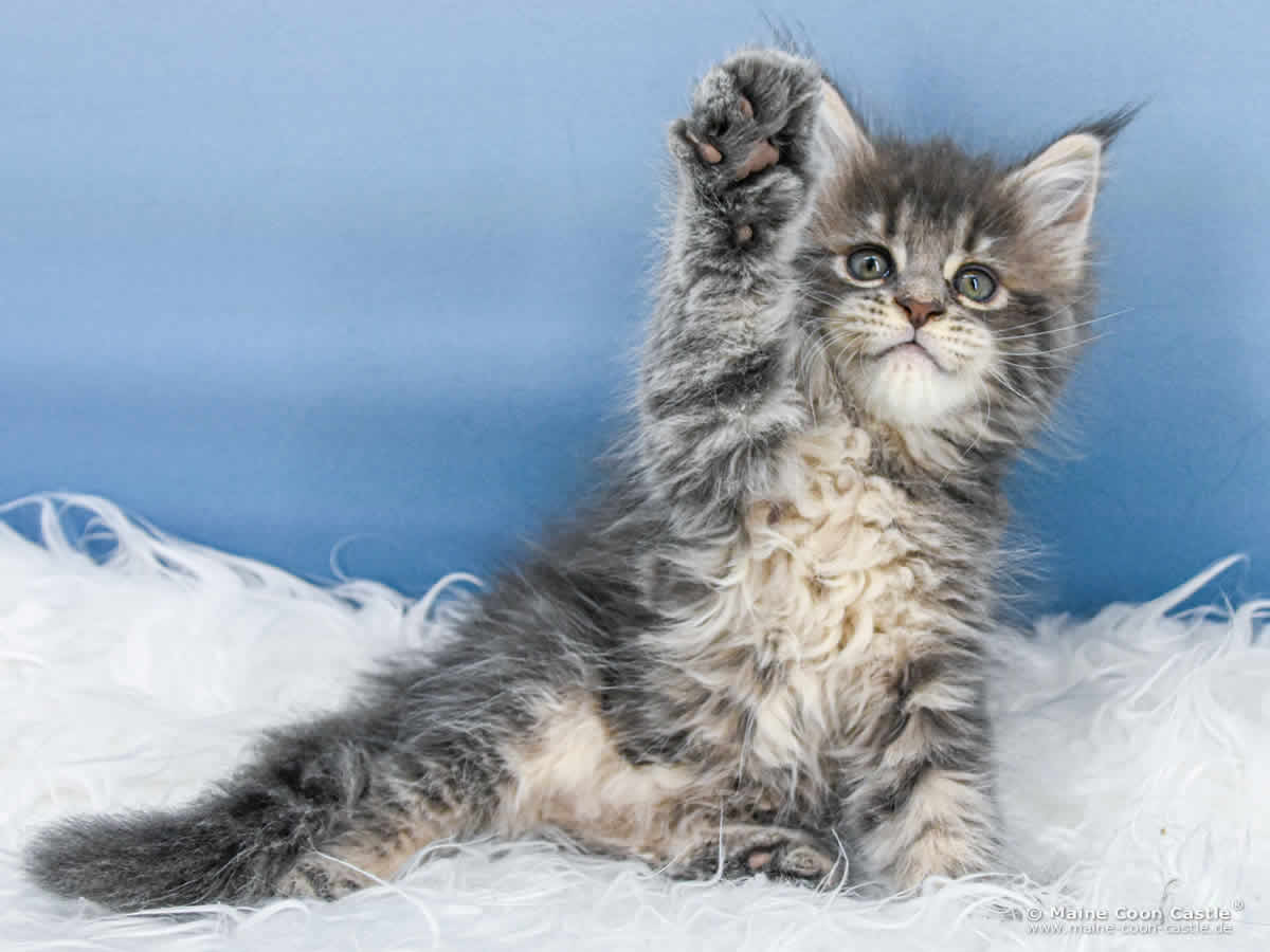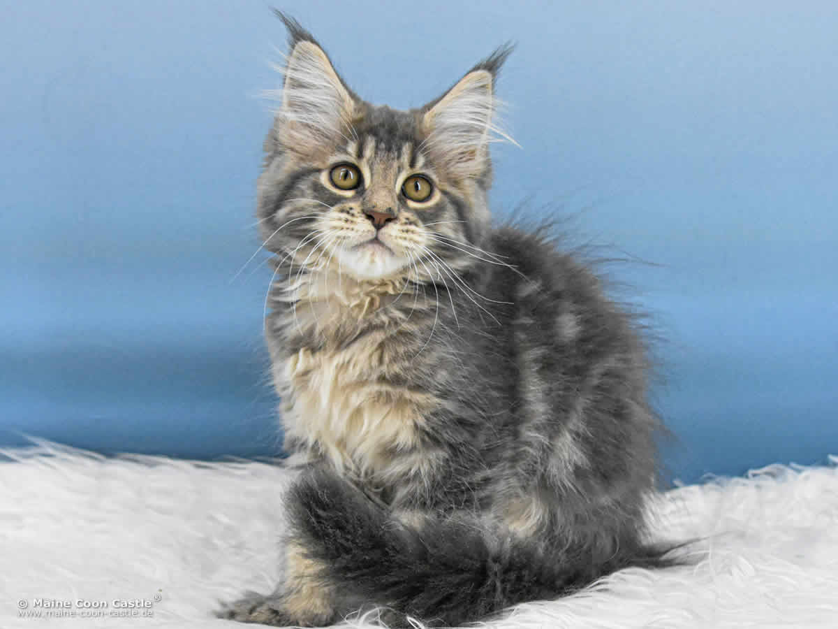Blau, quadratisch und mit Bullerkopf. In dem Maine Coon Kitten E4 Emmy zeigen sich die alten Zuchtlinien von Maine Coon Castle.
