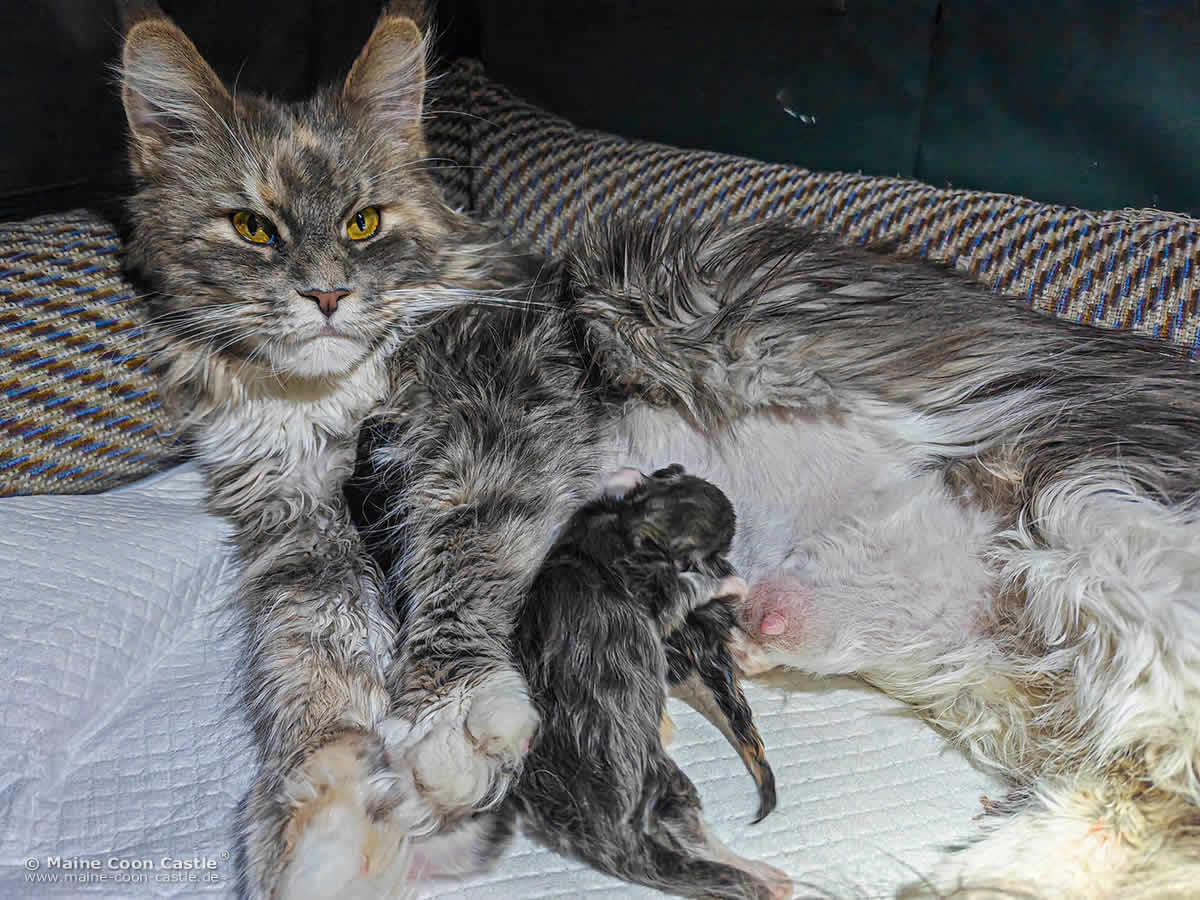 Die Maine Coon Katze Midnightfire’s Daireen hat am 18.02.2026 die Maine Coon Kitten vom G4 Wurf der Maine Coon Zucht Maine Coon Castle geboren.